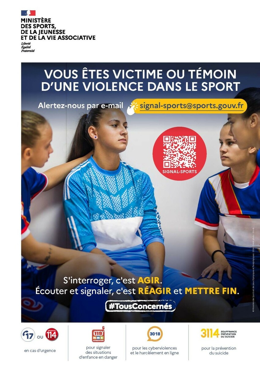 Depuis le 19 novembre 2025, tous les clubs sportifs ont l’obligation d’afficher ces visuels de prévention dans l’ensemble des espaces fréquentés :
